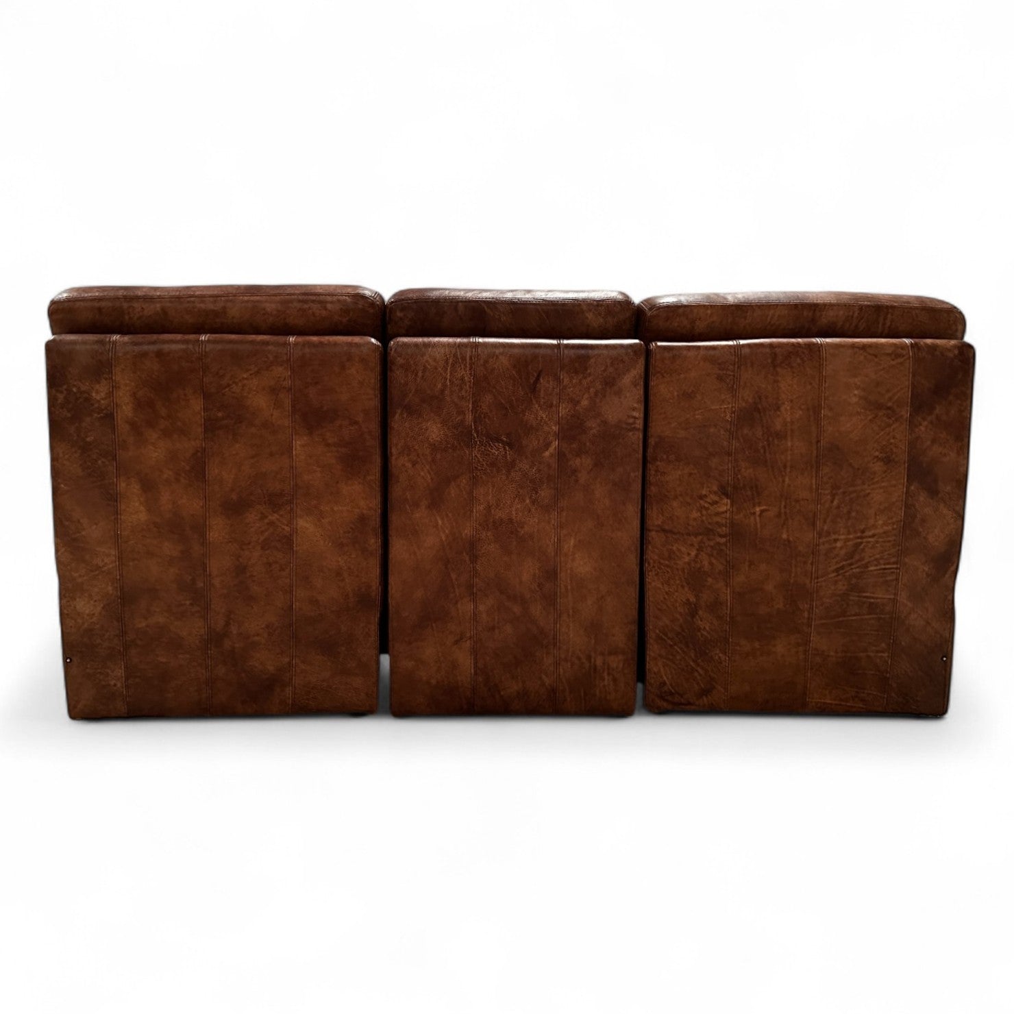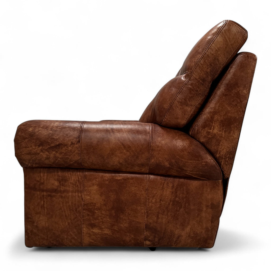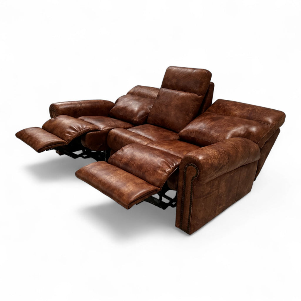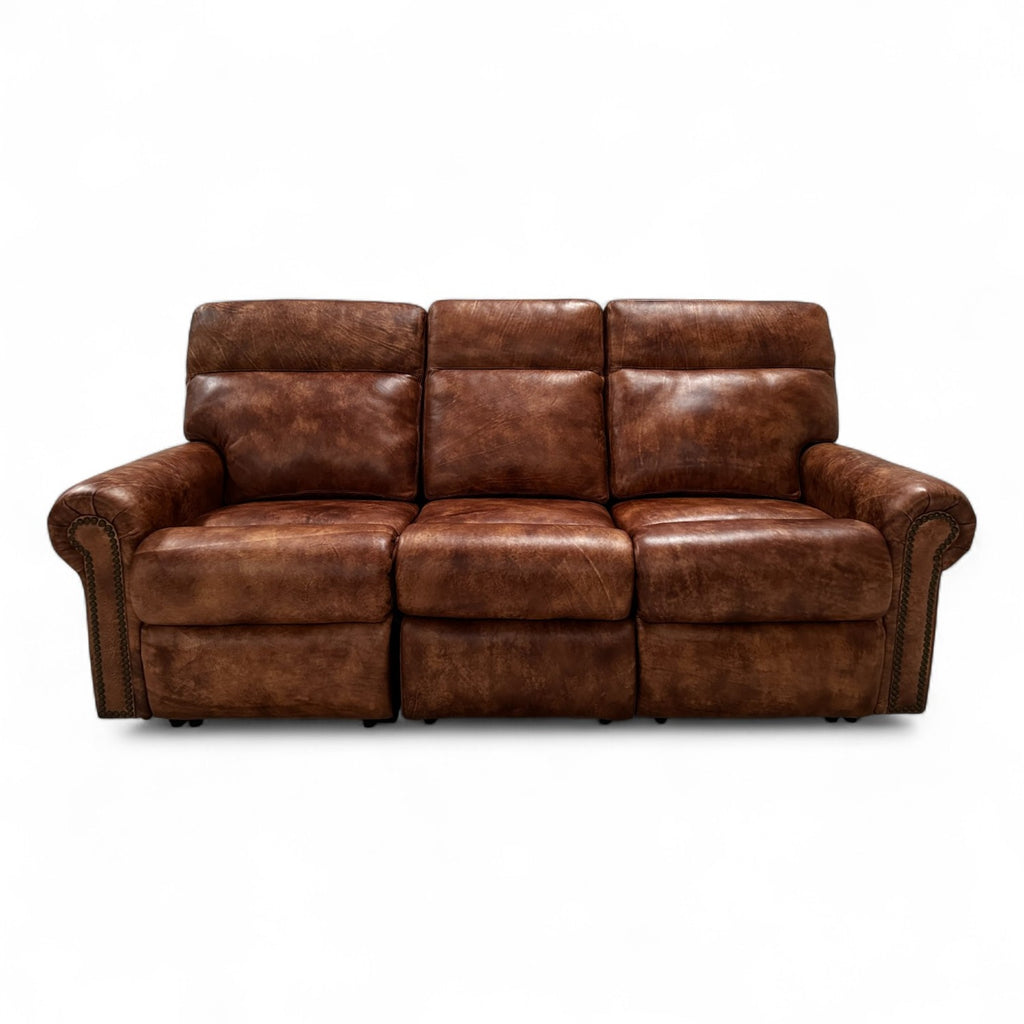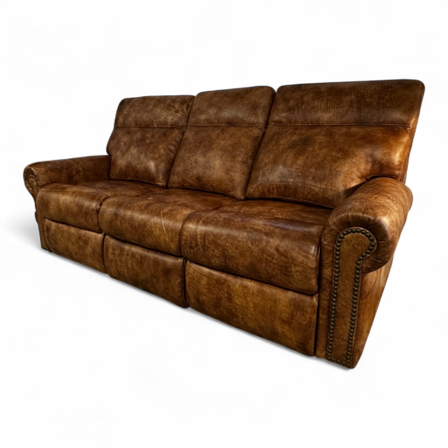 The Cedar Falls Reclining Sofa blends luxurious comfort with timeless character, wrapped in rich Legends Moccasin leather—a hand-rubbed aniline hide from South America that showcases deep tonal variation and a beautifully broken-in look. Handcrafted in the USA, this sofa offers exceptional relaxation with foam seats and Dacron-filled backs and seat tops that cradle you in plush support. Brass nailhead trim accents the classic rolled-arm silhouette, highlighting its warm color palette and refined detailing. Designed for effortless lounging and elevated style, the Cedar Falls Reclining Sofa brings enduring comfort and artisanal quality to any space.