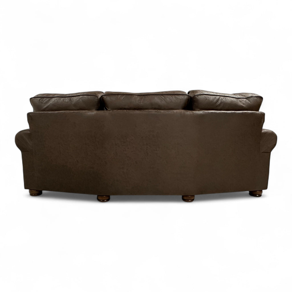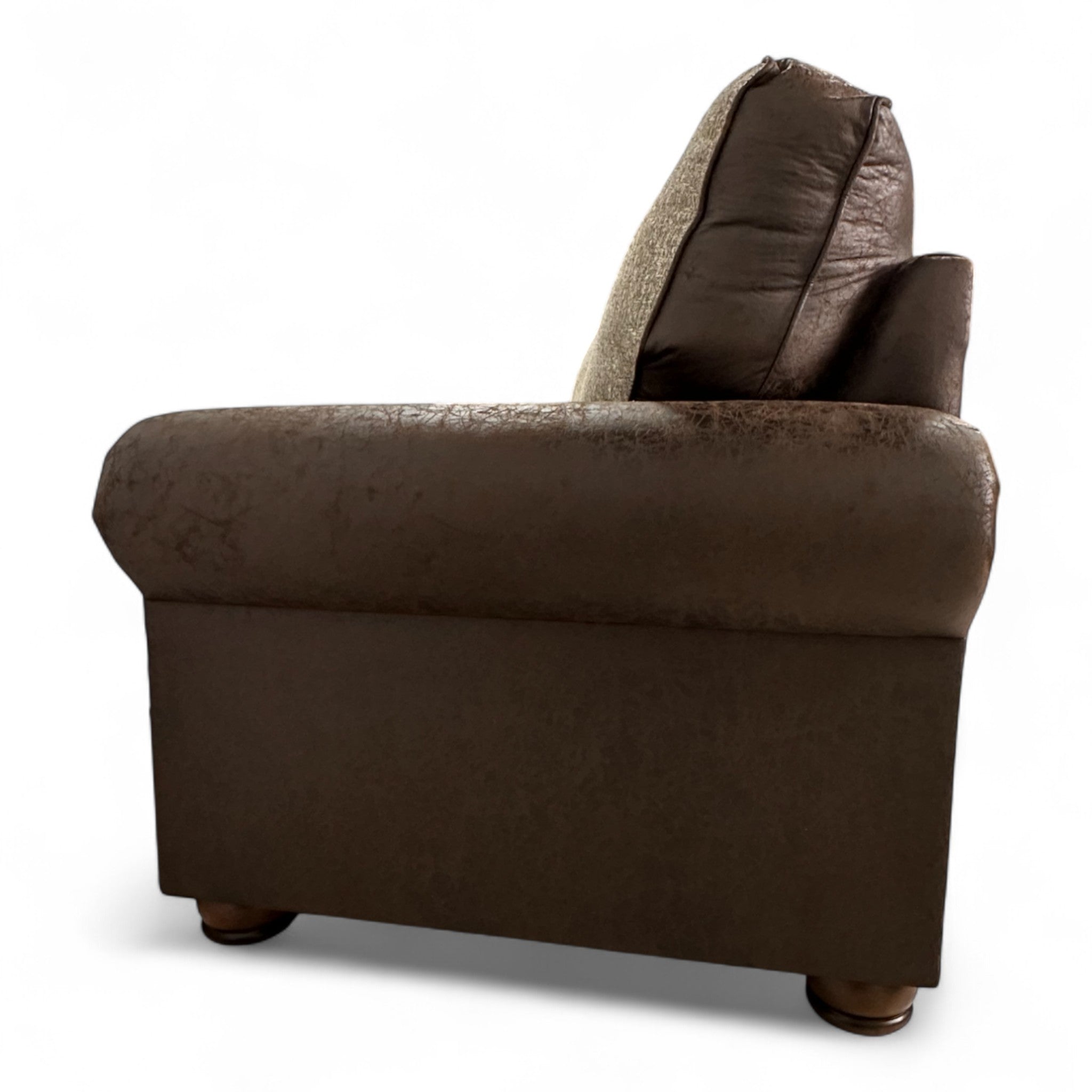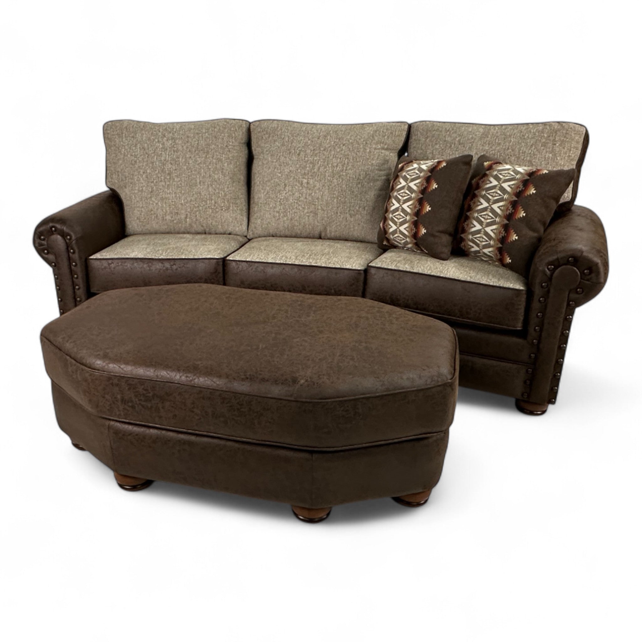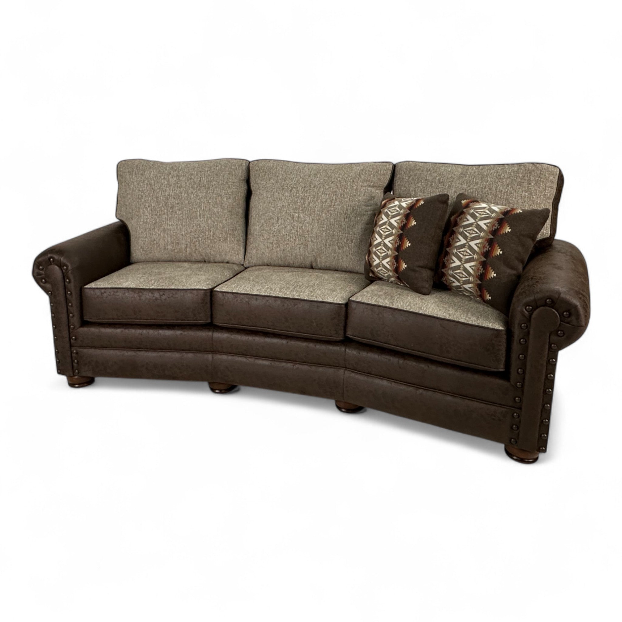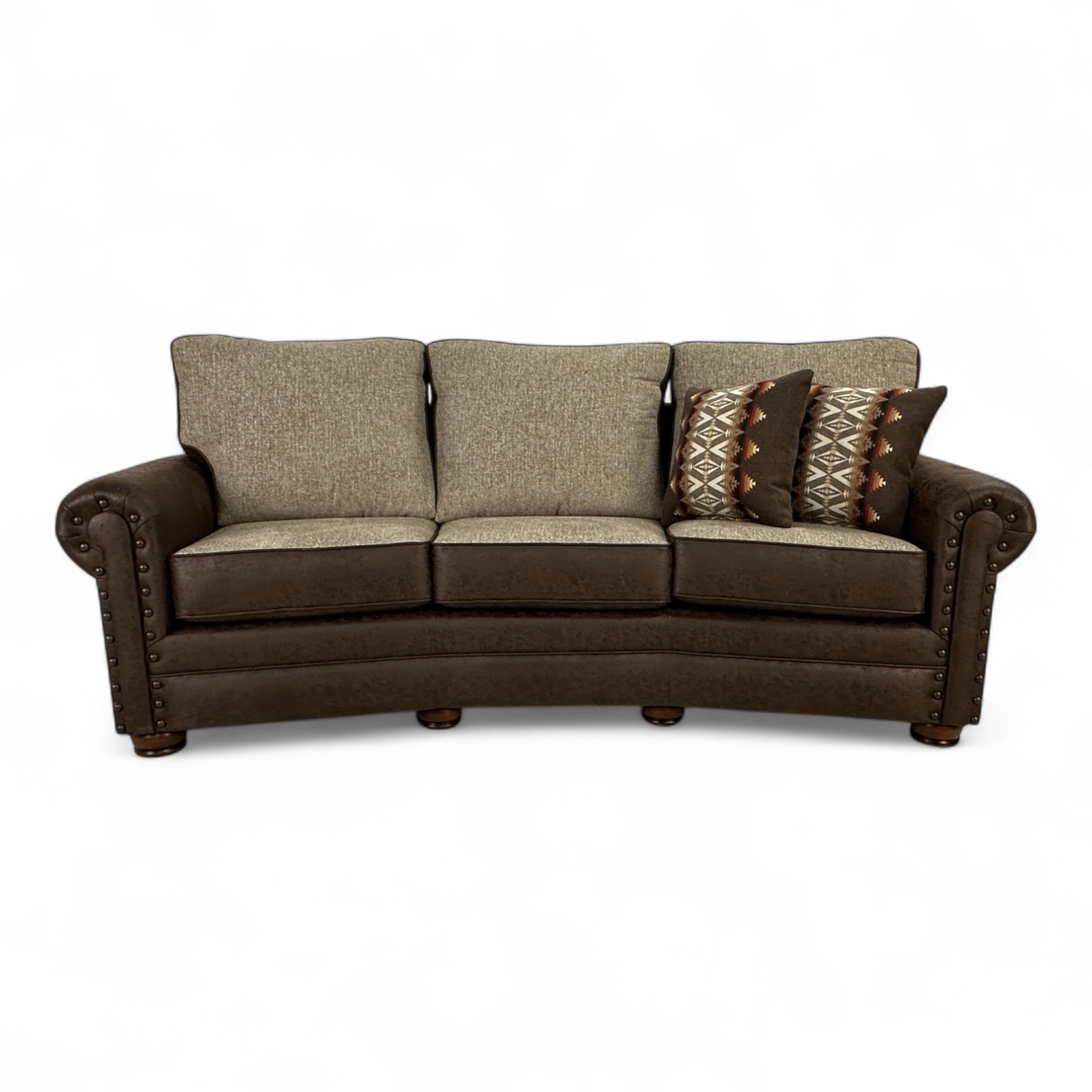 The Alden Sedona Conversation Sofa blends classic comfort with refined western style. Upholstered in Colt Brown and Anders Oatmeal fabrics, this sofa offers a rich mix of textures and tones, perfect for creating a warm and inviting space. Handcrafted in the USA, it features foam seats with Dacron-filled backs and seat tops for exceptional comfort and support. The dark brown leg finish complements the sofa’s gentle curves and rolled arms, while antique brown nailhead trim adds a touch of rugged sophistication. (2) 18" pillows in Pacific Crest Brown fabric complete the look with a hint of rustic charm. The Alden Sedona brings timeless appeal and craftsmanship to any living area.