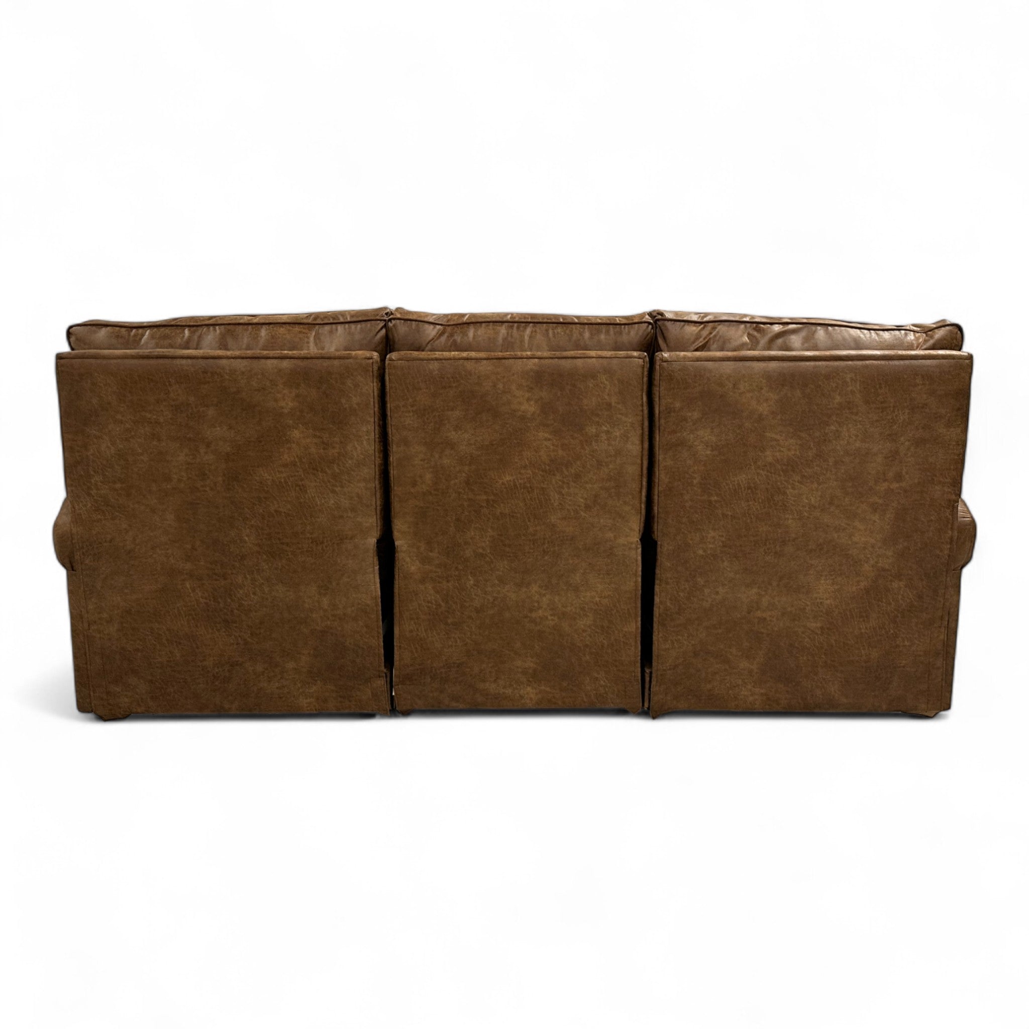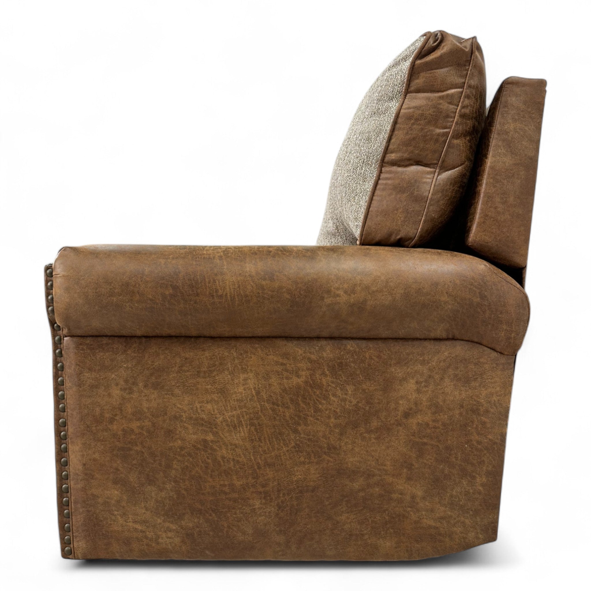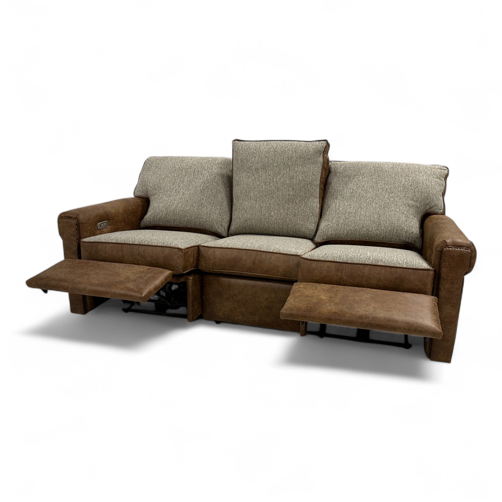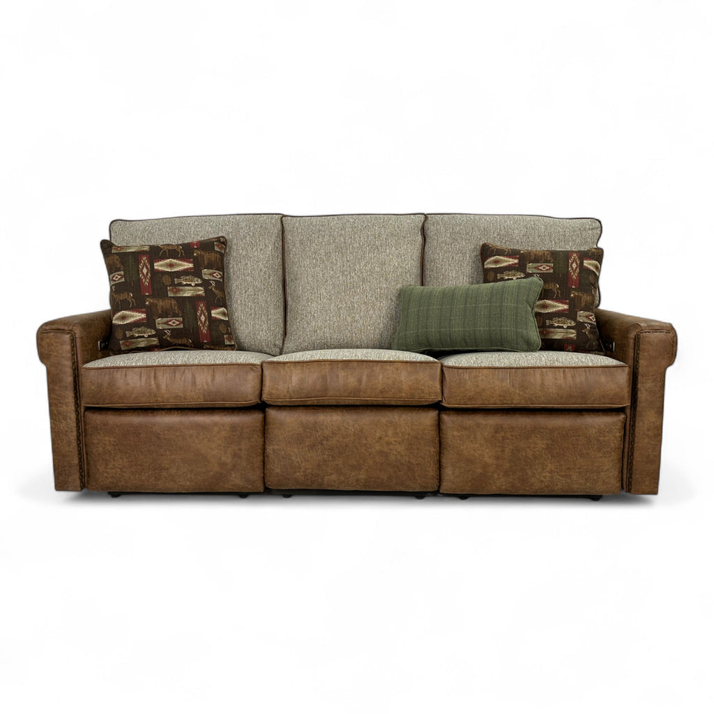 The Fairfield Ridge Reclining Sofa blends comfort, craftsmanship, and refined detail. Upholstered in a handsome mix of Palance Chestnut microfiber and Marble Stone fabric, it offers a warm, versatile look that works beautifully in lodge-inspired and transitional spaces. Antique brass nailhead trim highlights the tailored design, while power reclining allows you to find your perfect level of comfort with ease.