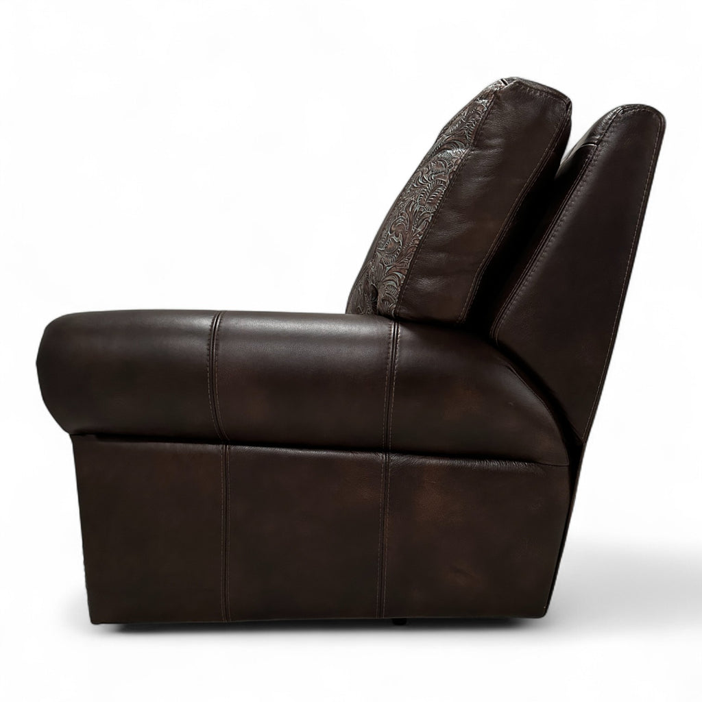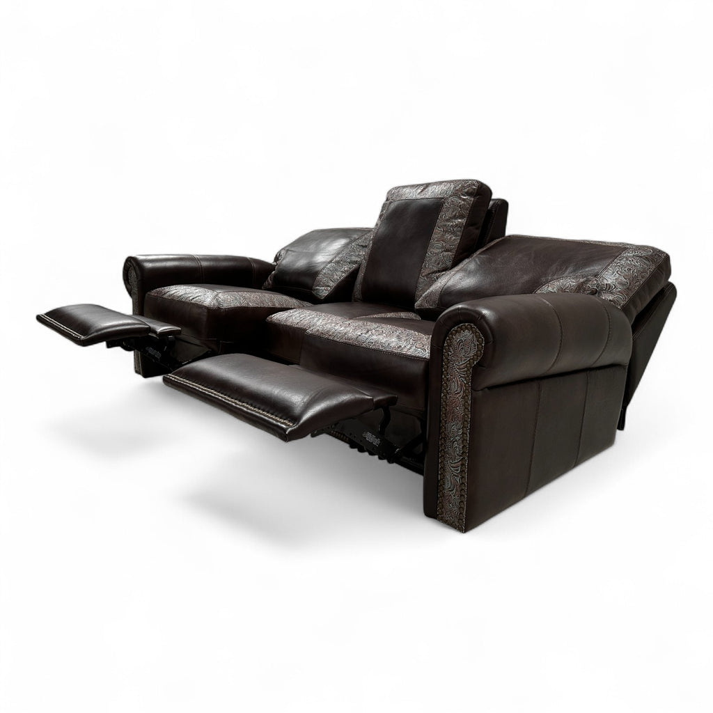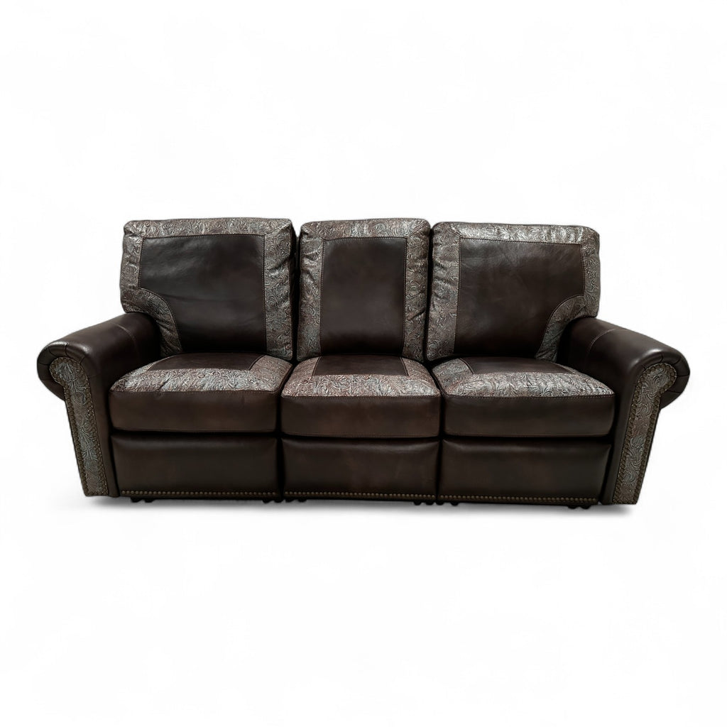 The Forest Lake Branock Sofa blends rugged luxury with elevated craftsmanship, creating a statement piece built for comfort, character, and long-lasting appeal. Upholstered in Legends Wagon Wheel leather— a hand-rubbed aniline sourced from South America—this sofa showcases deep earthy tones and a naturally textured, time-worn richness. Designer leather accents frame each seat and back cushion, adding depth and contrast that highlight the sofa’s graceful lines. Handcrafted in the USA, it features foam seats with Dacron-filled backs and seat tops for reliable support and relaxed softness. Brass nailhead trim completes the look with warm, classic detailing, making the Forest Lake Branock Sofa a striking anchor for any living space.