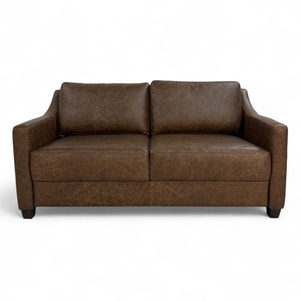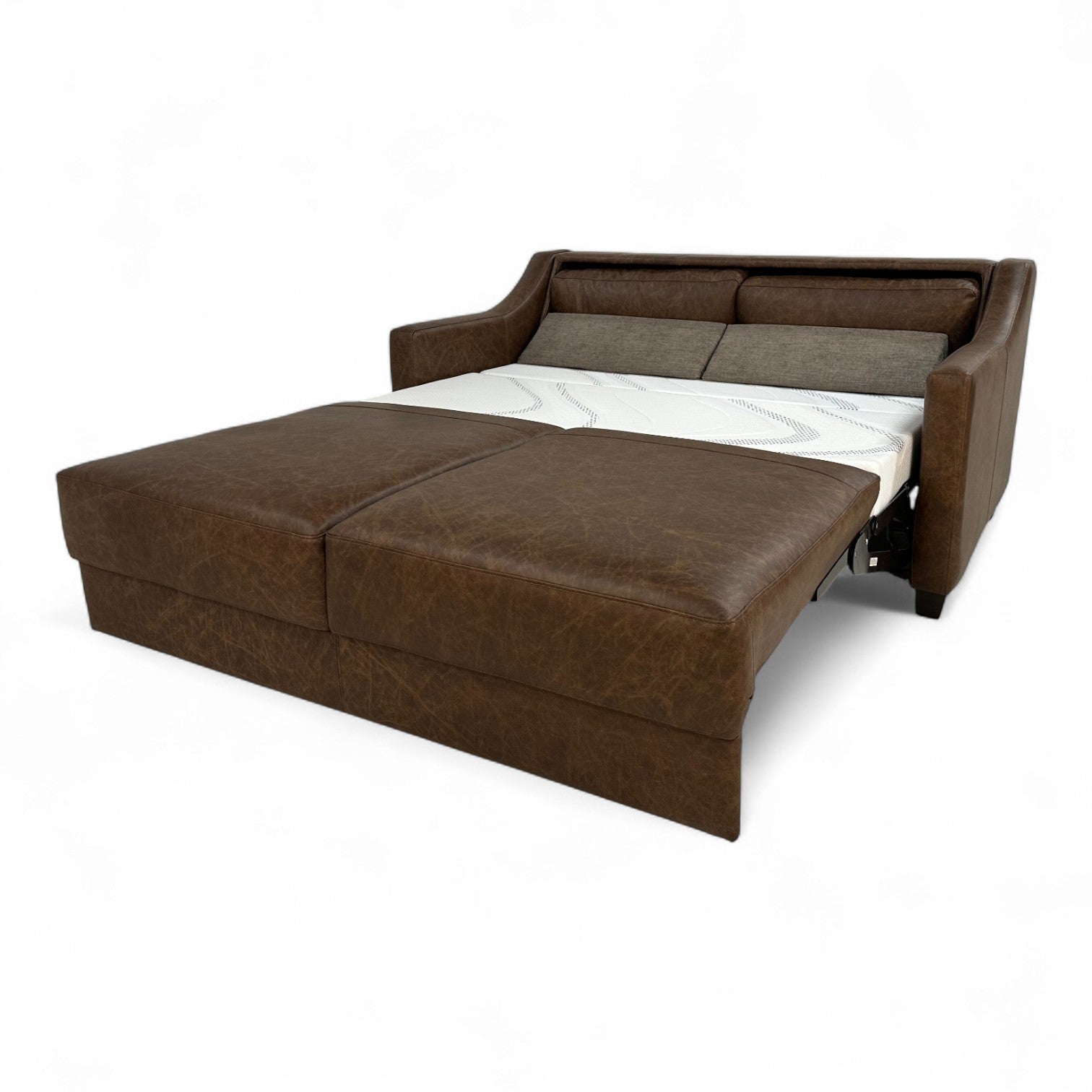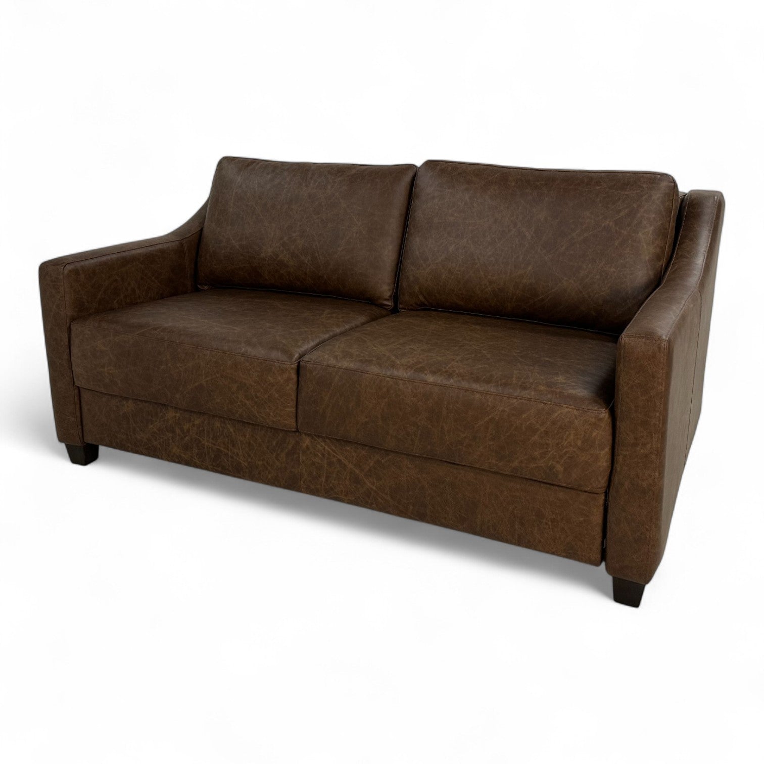 The Joy Slofa offers refined style and unmatched versatility, blending luxurious comfort with practical design. Upholstered in Saloon Rum leather, a top grain aniline hide from Brazil, this piece showcases the natural beauty and character of genuine leather. Expertly crafted in the USA with a walnut leg finish, the Joy Slofa transforms effortlessly for guests—simply remove the back cushions (leave the seat cushions in place) to reveal a plush mattress for restful sleeping comfort. With its clean silhouette and rich materials, the Joy Slofa brings sophistication and function to any space.