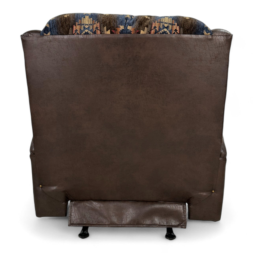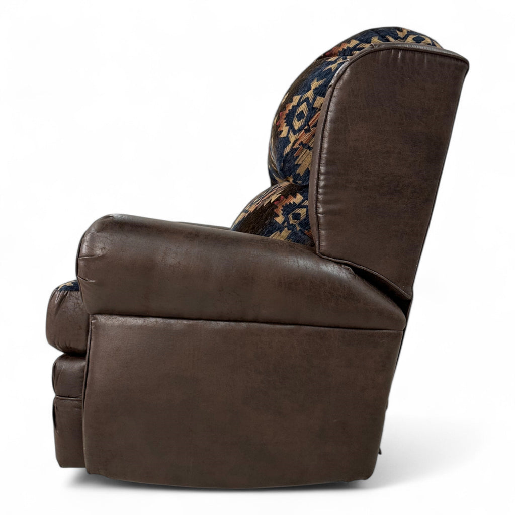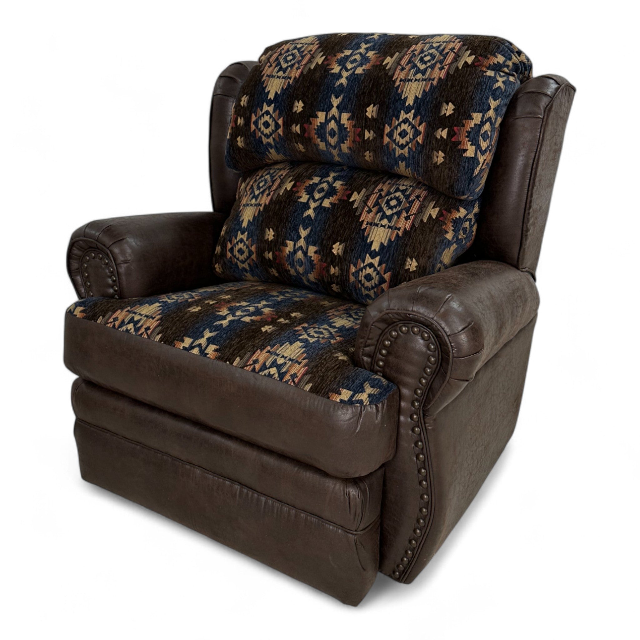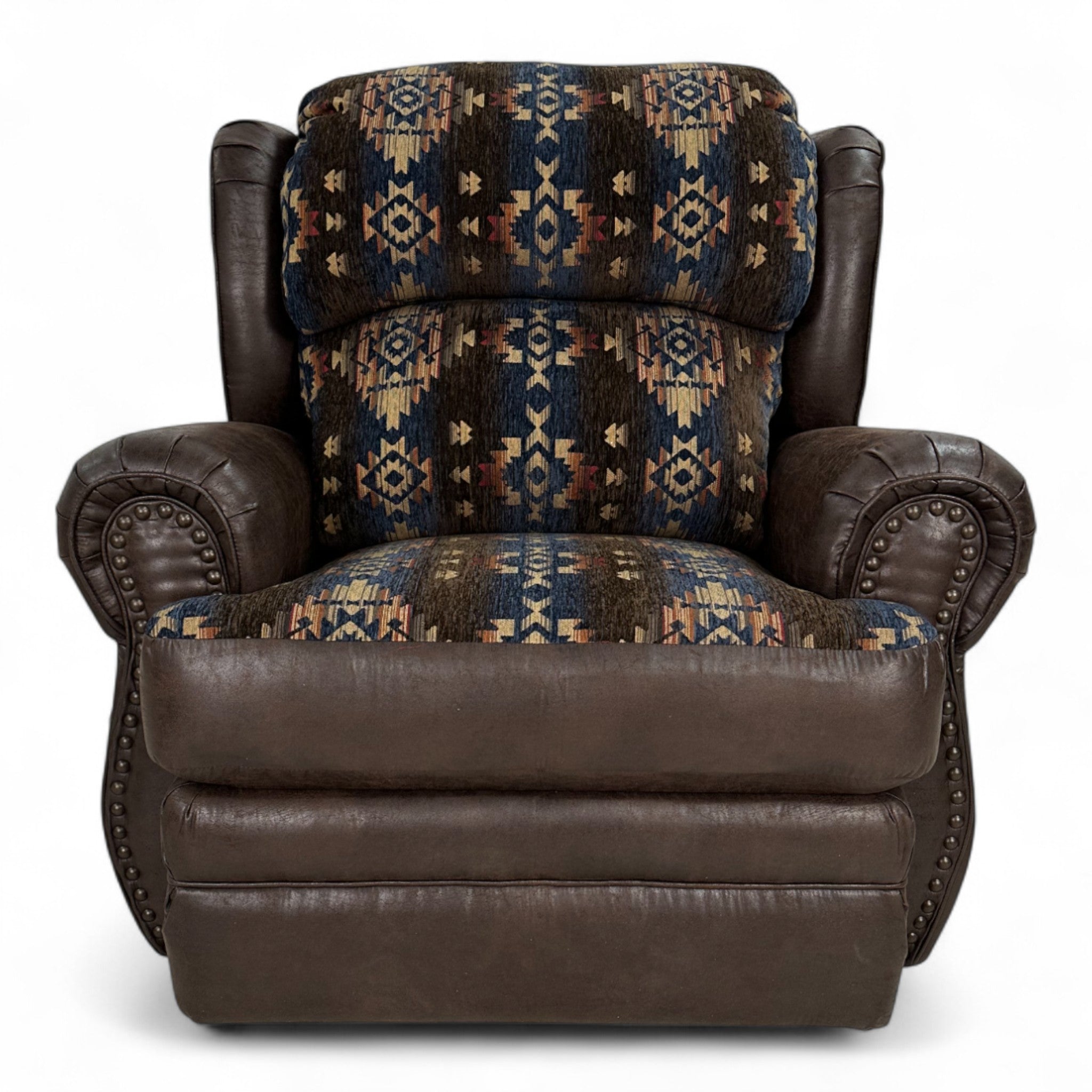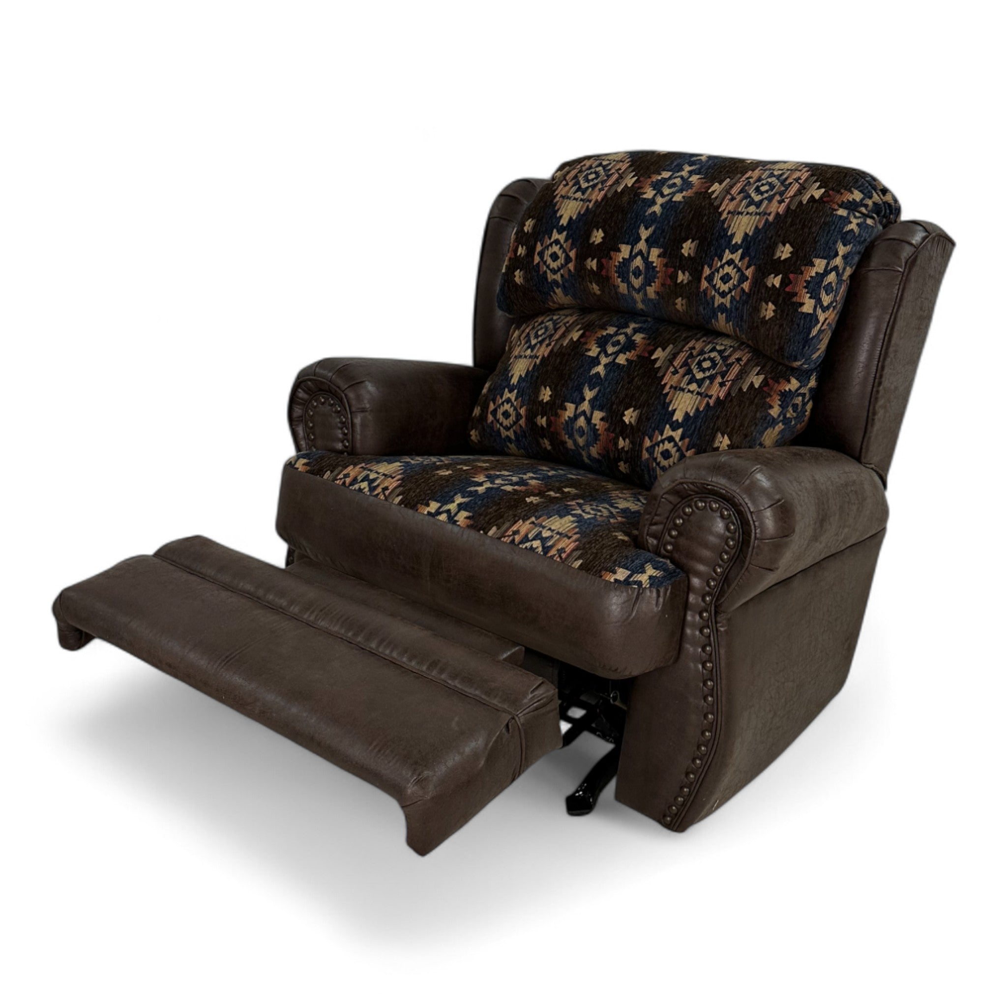 The Pryor Indigo Rocker Recliner offers a perfect balance of comfort, style, and craftsmanship. Upholstered in Palance Sable microfiber and accented with Navajo Midnight fabric, this recliner features rich tones and a bold patterned design that enhances any living space. Handcrafted in the USA, it features foam seats with Dacron-filled backs and seat tops for long-lasting comfort and support, while antique brown nailhead trim adds a refined finishing touch. Designed for smooth, gentle motion, the rocker recliner invites relaxation at the end of the day. Proudly made in the USA for exceptional quality and durability.