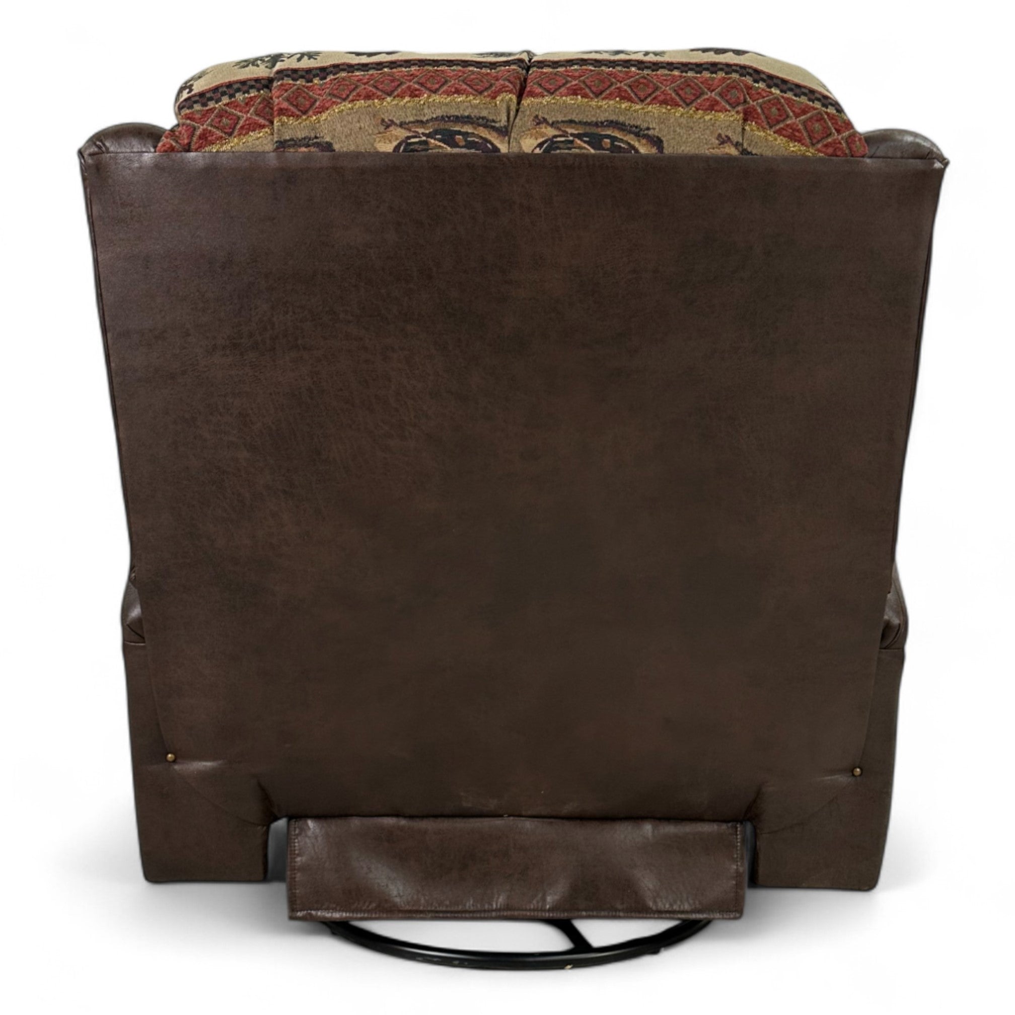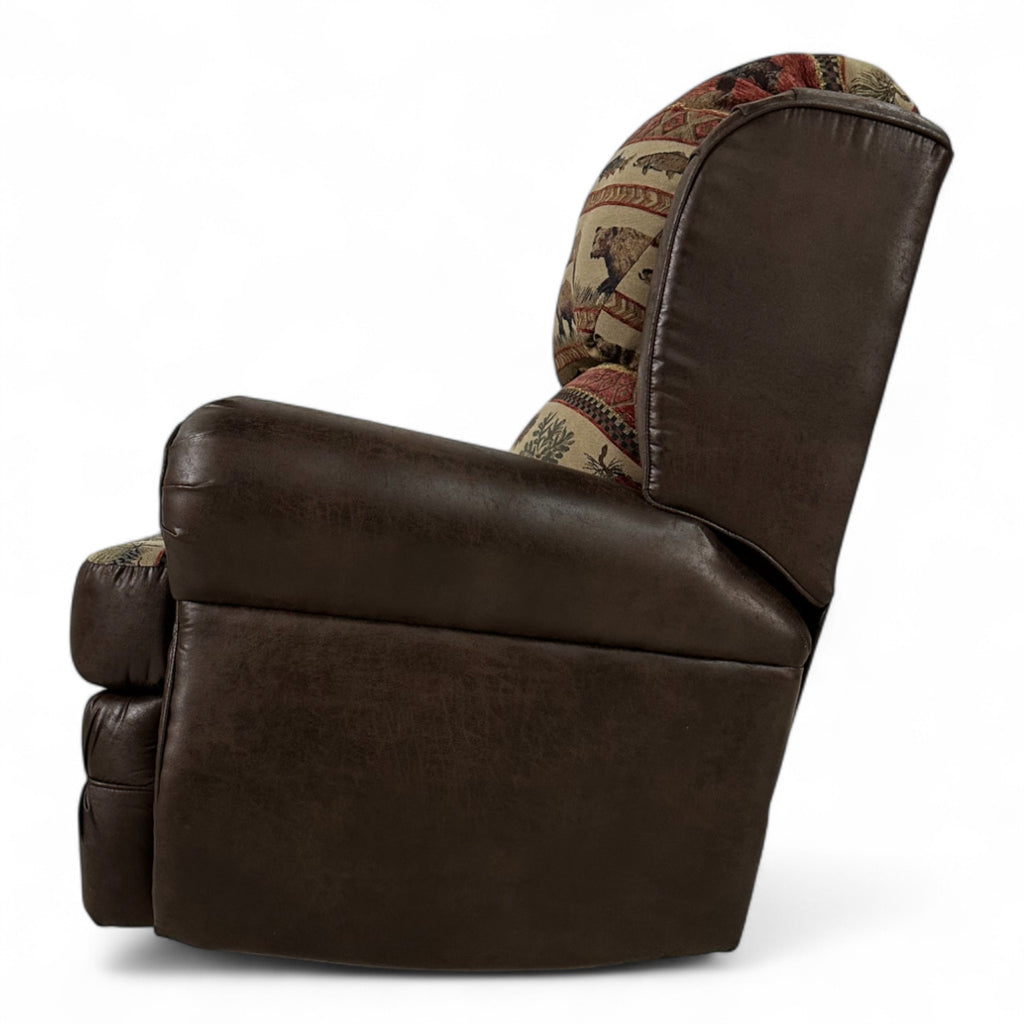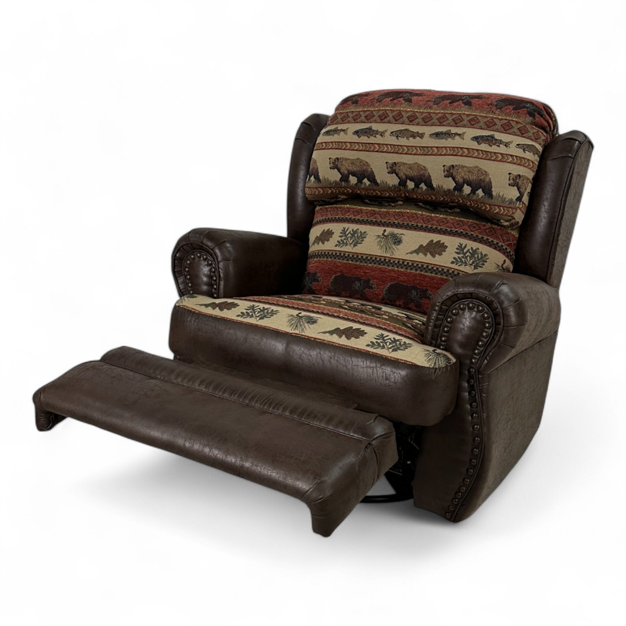 The Pryor Horizon Swivel Rocker Recliner brings rustic comfort and style to your living space with its inviting design and detailed craftsmanship. Upholstered in Palance Sable microfiber and accented with Big Lake Horizon fabric, this recliner blends earthy tones and lodge-inspired patterns for a warm, cabin-ready look. Handcrafted in the USA, it features foam seats with Dacron-filled backs and seat tops for long-lasting comfort and support, while antique brown nailhead trim adds a refined finishing touch. Featuring a smooth swivel and rocking motion, this recliner is as functional as it is stylish.