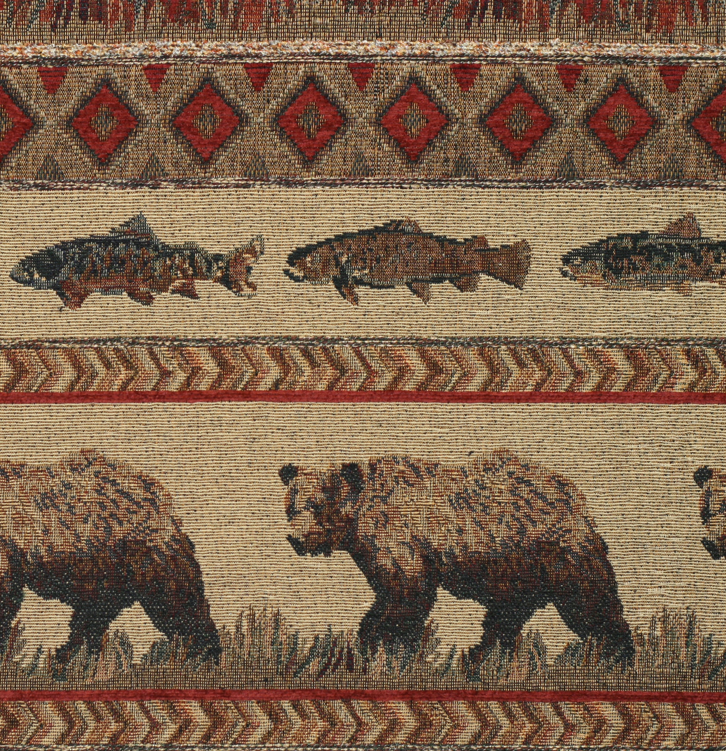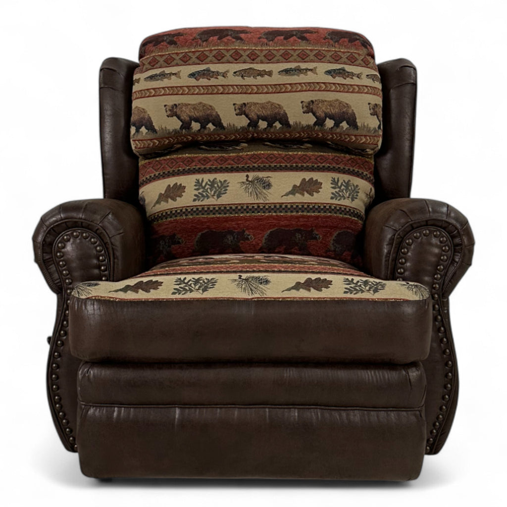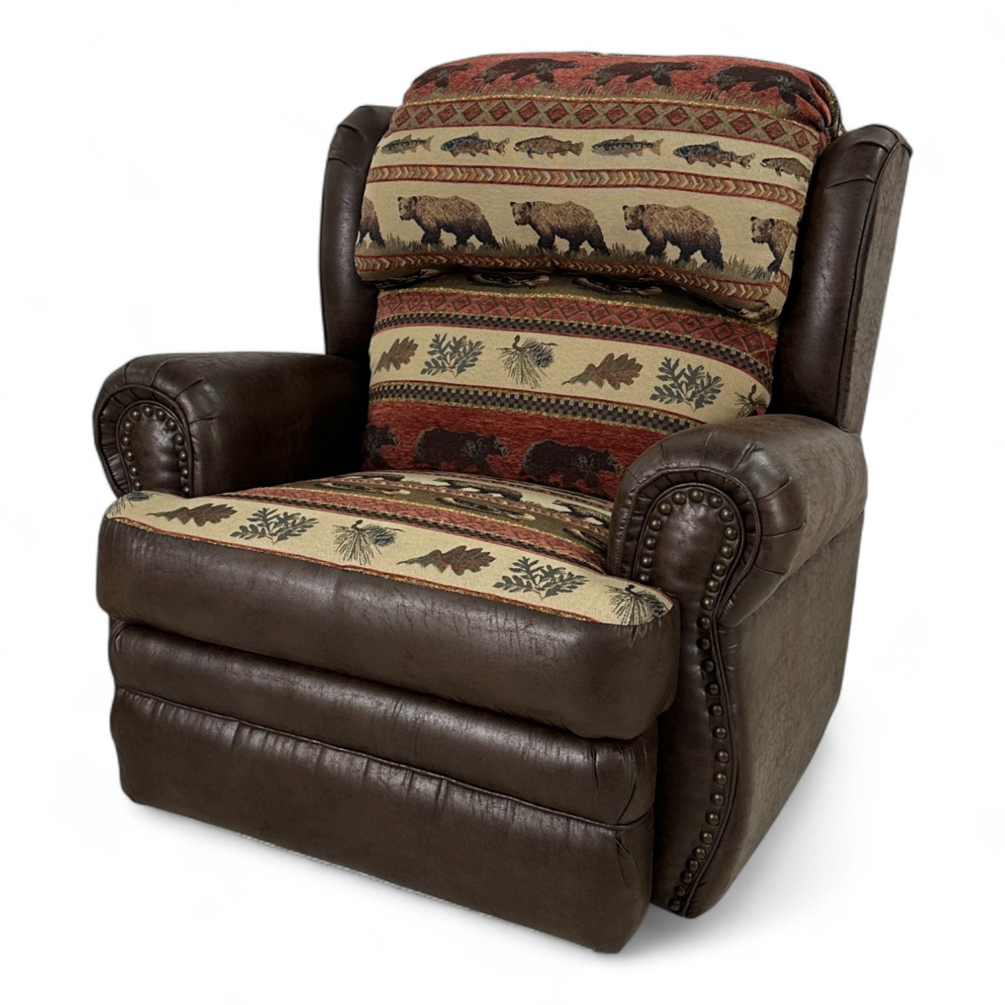The Pryor Horizon Swivel Rocker Recliner brings rustic comfort and style to your living space with its inviting design and detailed craftsmanship. Upholstered in Palance Sable microfiber and accented with Big Lake Horizon fabric, this recliner blends earthy tones and lodge-inspired patterns for a warm, cabin-ready look. Handcrafted in the USA, it features foam seats with Dacron-filled backs and seat tops for long-lasting comfort and support, while antique brown nailhead trim adds a refined finishing touch. Featuring a smooth swivel and rocking motion, this recliner is as functional as it is stylish.