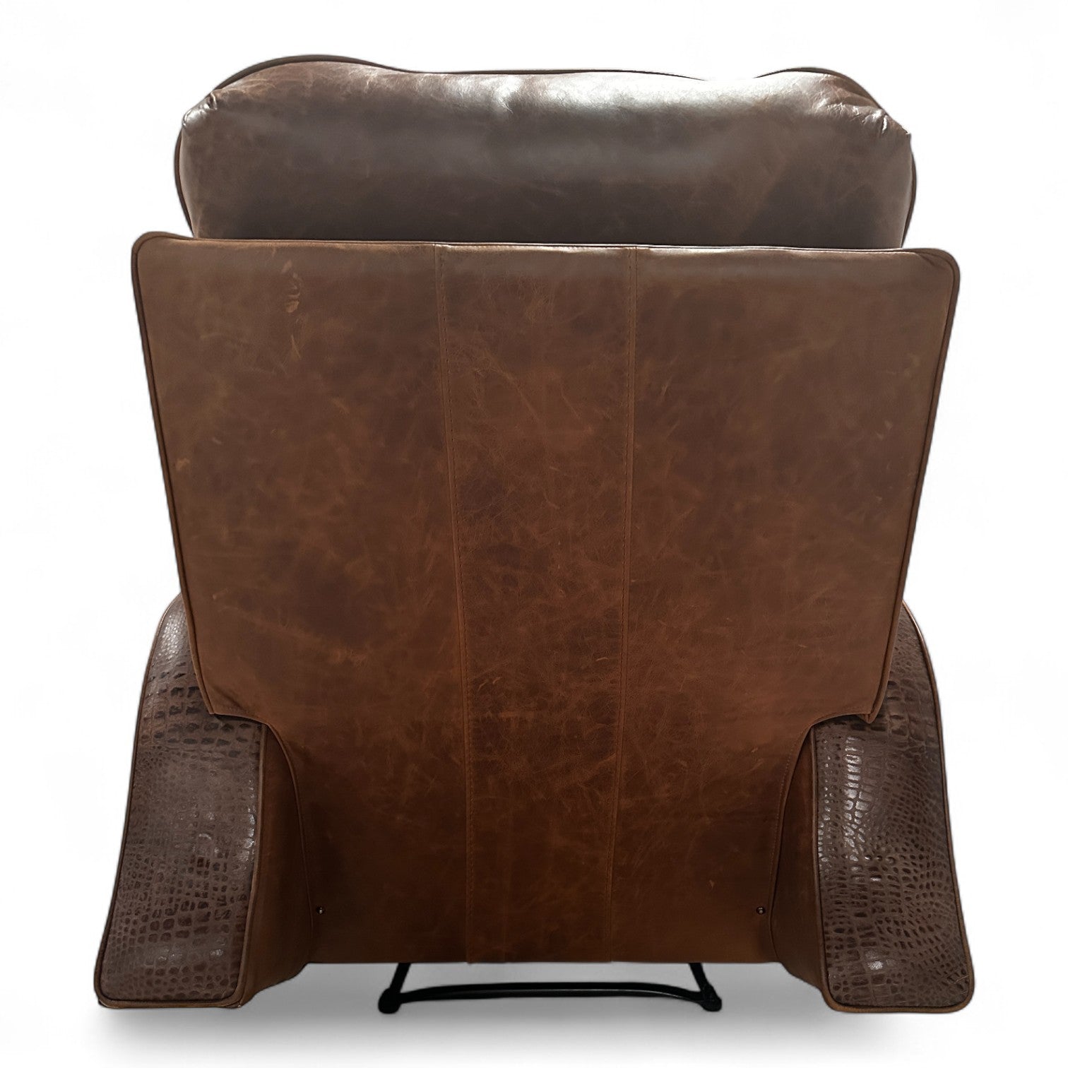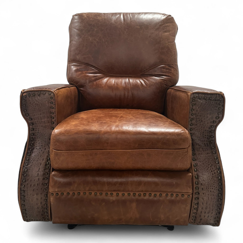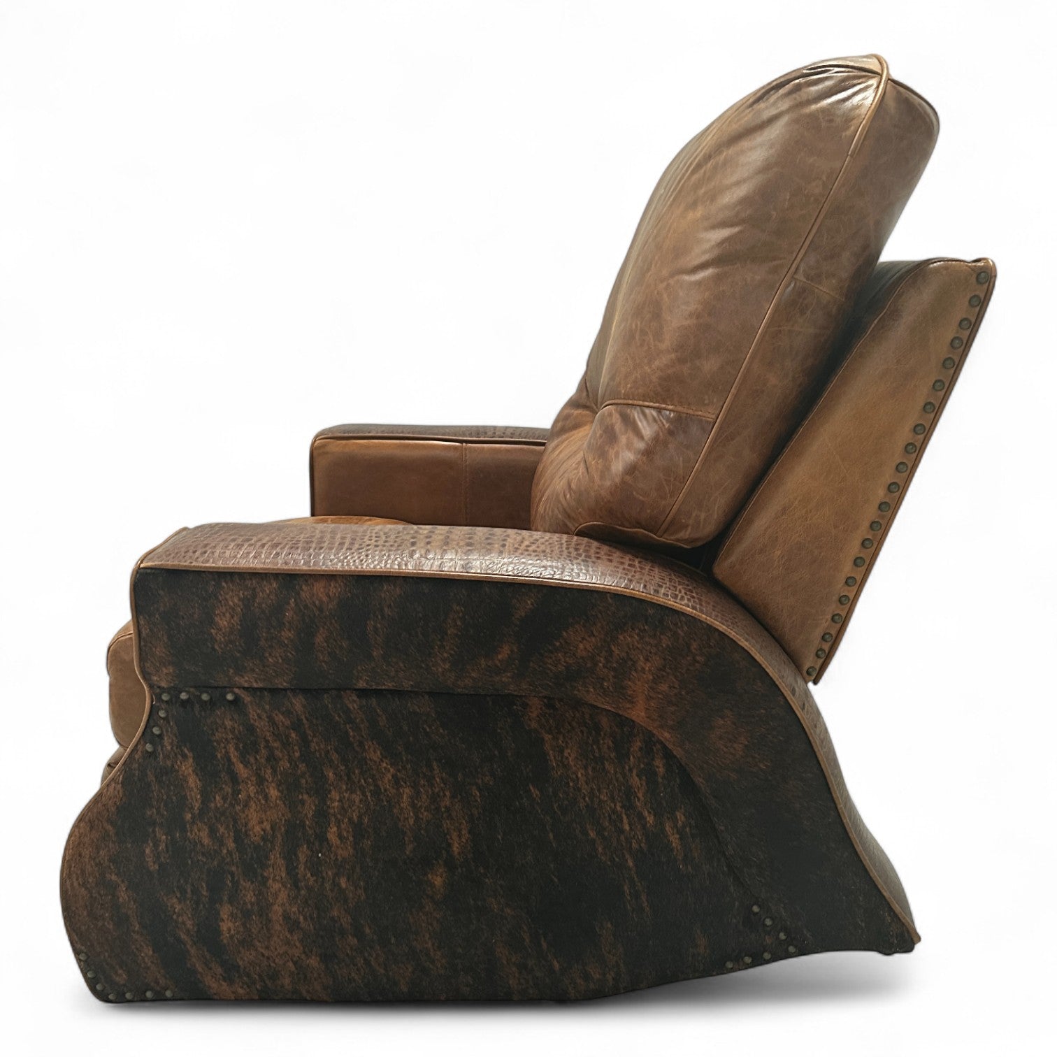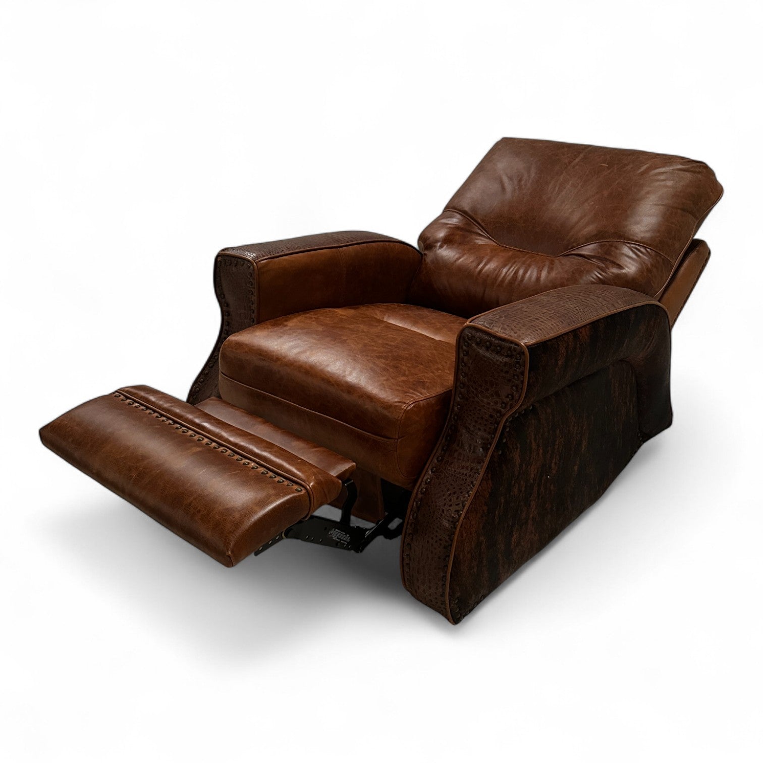The Rawlins Truett Recliner blends rich materials, artisan detailing, and luxurious comfort into a statement piece with undeniable character. Upholstered in premium Burling Ranch leather—an authentic top-grain aniline hide sourced from Europe—it offers a beautifully natural texture and depth of color. Designer leather and hair-on-hide accents add contrast and individuality, enhancing the recliner’s sculpted silhouette and warm, rustic presence. Handcrafted in the USA, it features a supportive foam seat paired with a Dacron-filled back and seat top for an exceptionally comfortable, long-lasting sit. Brass nailhead trim frames the piece with refined detail, completing a recliner built to elevate any room with craftsmanship and style.