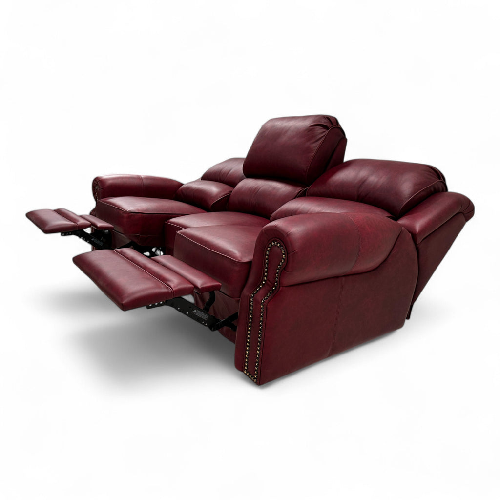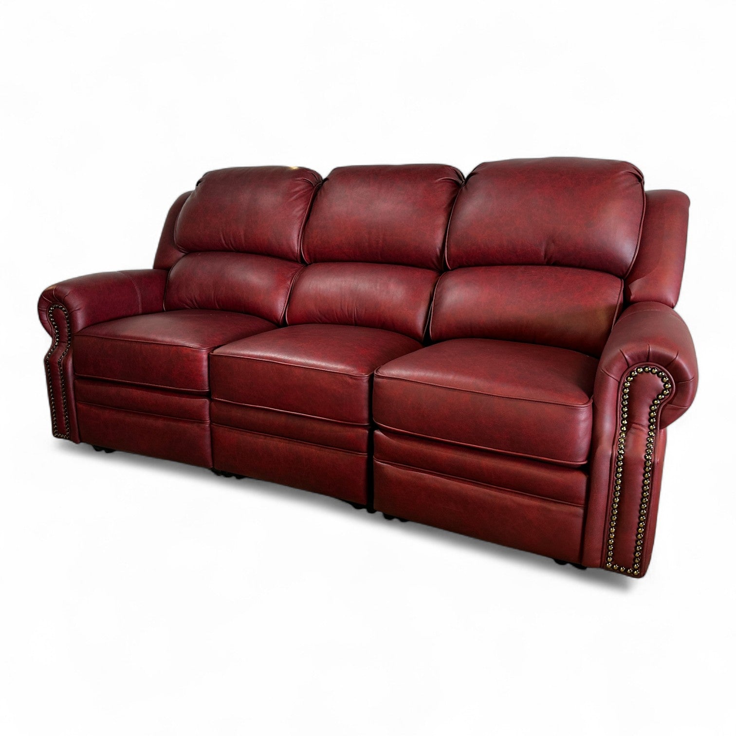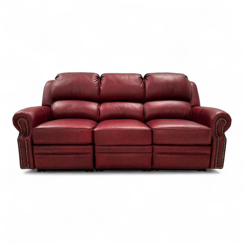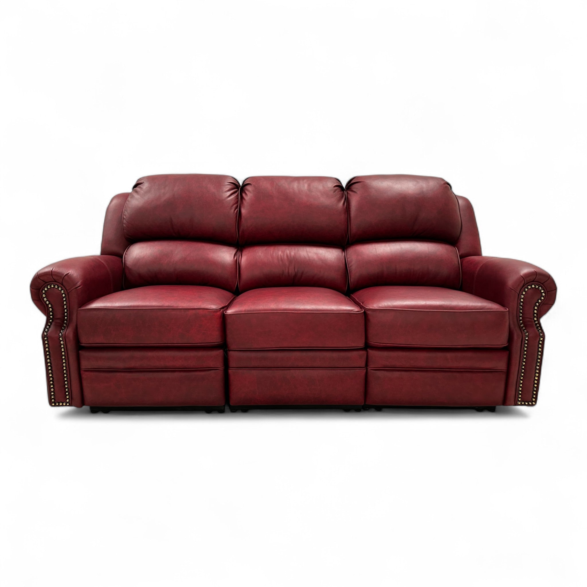 The Silverthorne Reclining Sofa blends classic design with inviting comfort. Its gently rolled arms, generous cushioning, and graceful silhouette make it a standout piece in any room. Upholstered in top-grain scratch resistant Saloon Oxblood leather, it has a smooth hand, crackled undertones, and only gets better with age. Detailed with antique nailhead trim, the Silverthorne carries a timeless presence. Handcrafted in the USA, the Silverthorne is built with foam seats and Dacron-filled backs and tops for resilient support, while the smooth reclining mechanism makes it easy to lean back and relax.