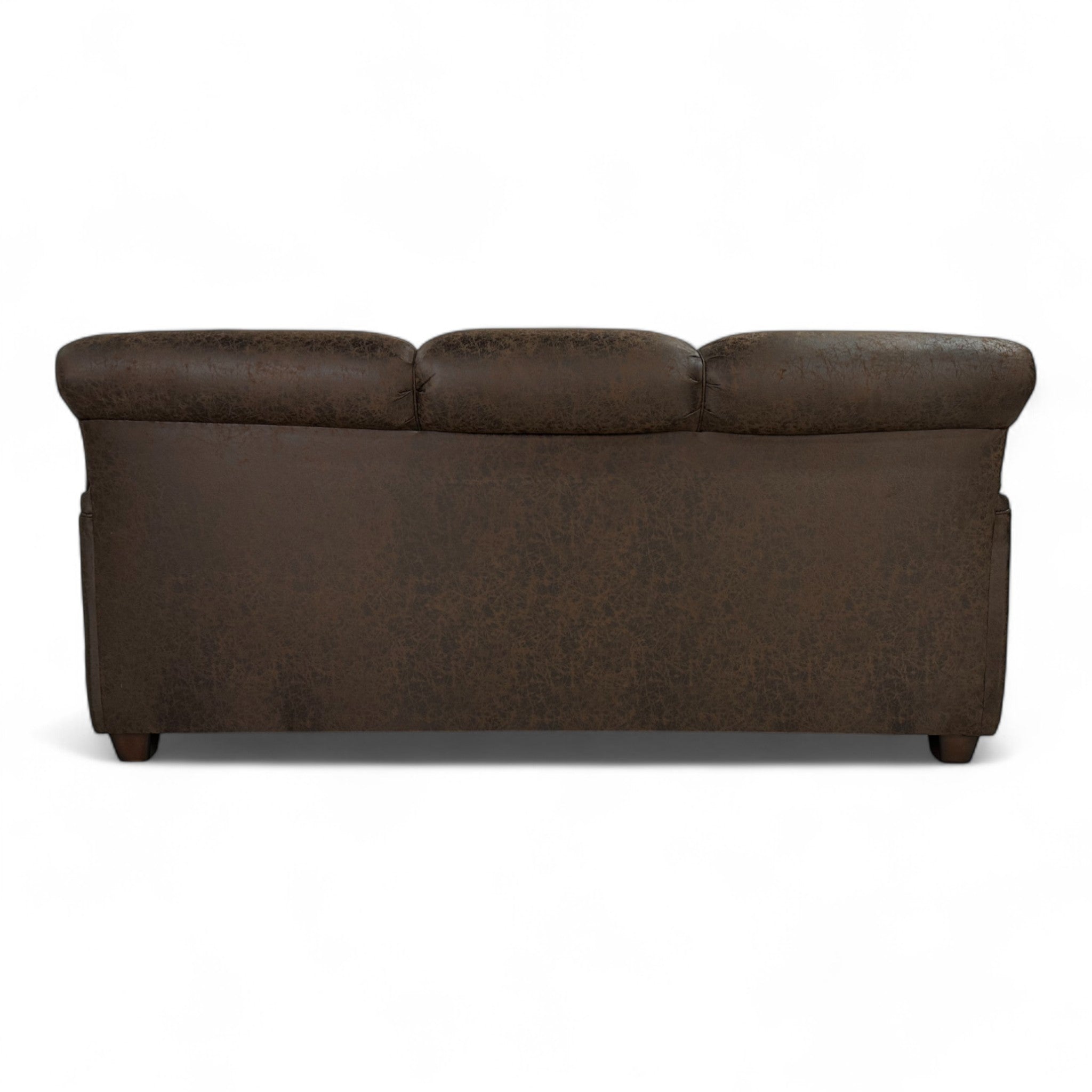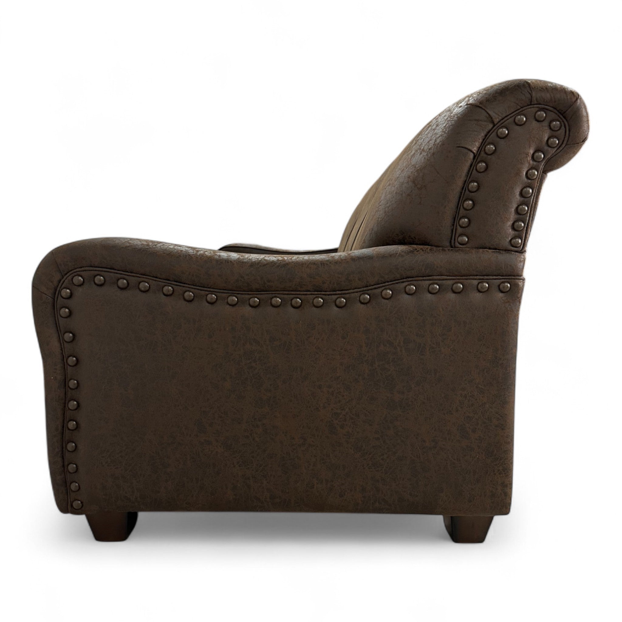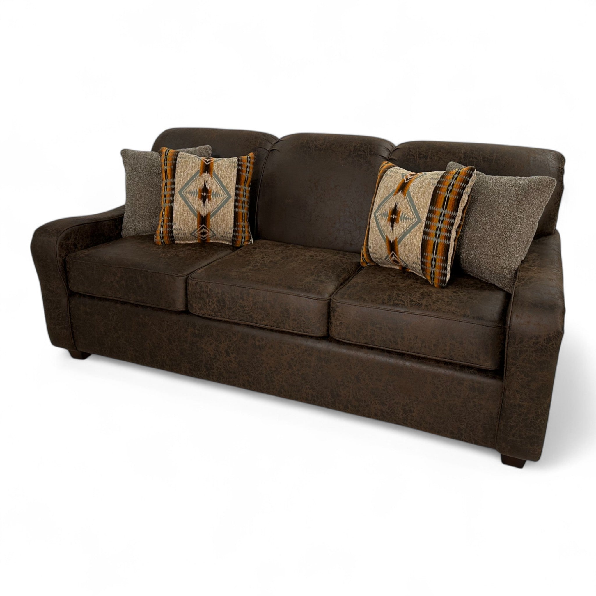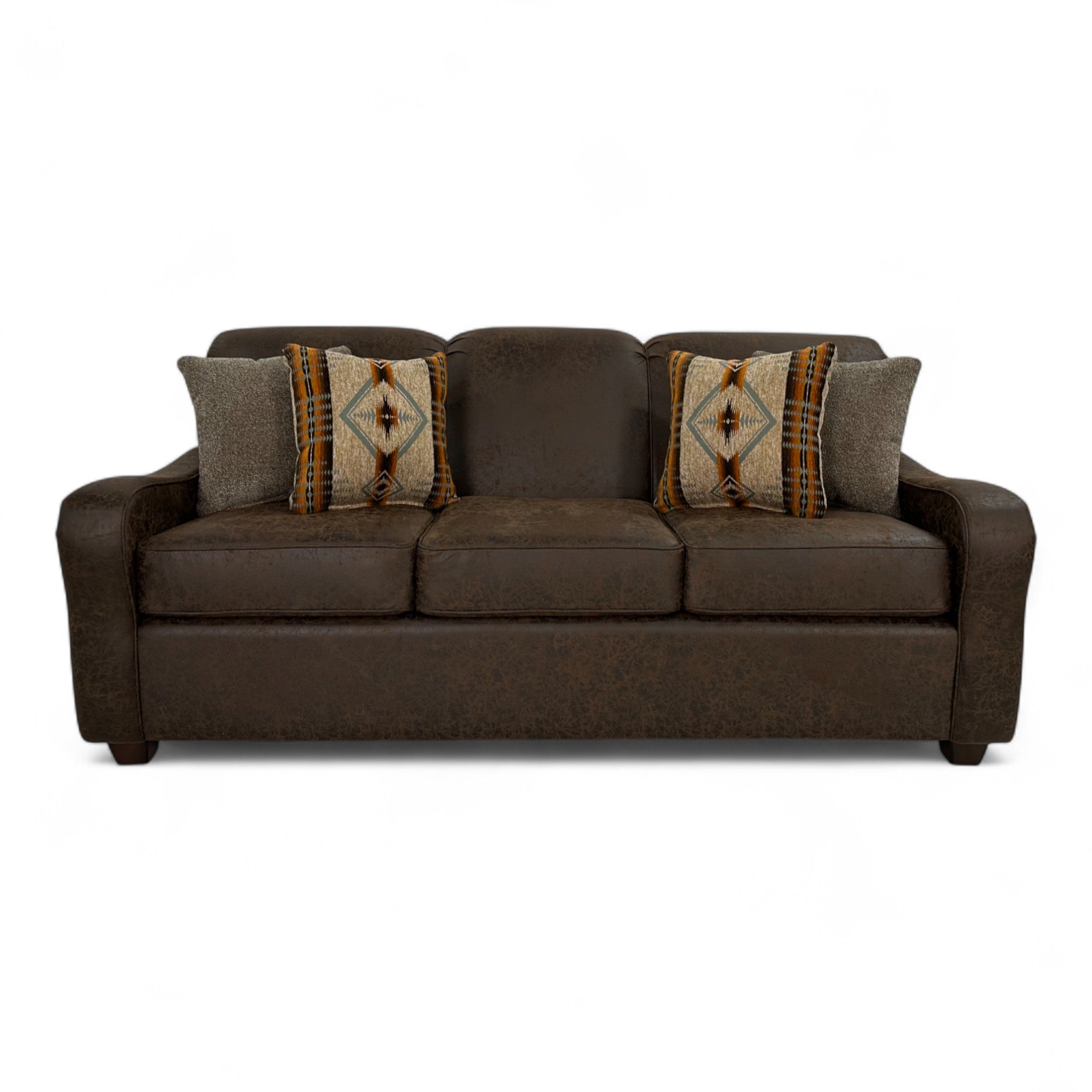 The Barker Arizona Sofa combines timeless design with inviting comfort, making it a standout piece for any space. Upholstered in Colt Brown microfiber, this sofa showcases a rich texture and warm tone that exudes rustic sophistication. Handcrafted in the USA, it features foam seats with Dacron-filled backs and seat tops for lasting comfort and support. The look is enhanced by a dark brown leg finish and large antique brown nailhead trim, adding depth and handcrafted detail. Four 18" pillows—two in Roam Mocha and two in Arizona Sand—bring layered pattern and color to complete the look. Perfect for both relaxed living and refined western interiors, the Barker Arizona Sofa blends craftsmanship and comfort seamlessly.