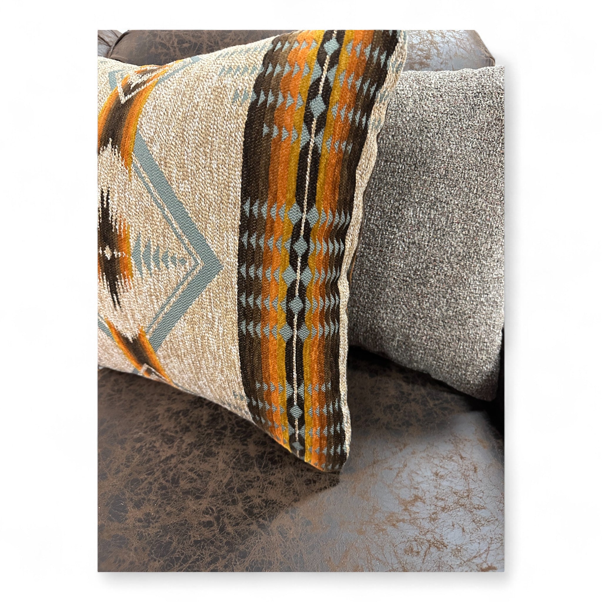 Includes (2) 18" pillows in Roam Mocha & (2) 18" pillows in Arizona Sand fabrics