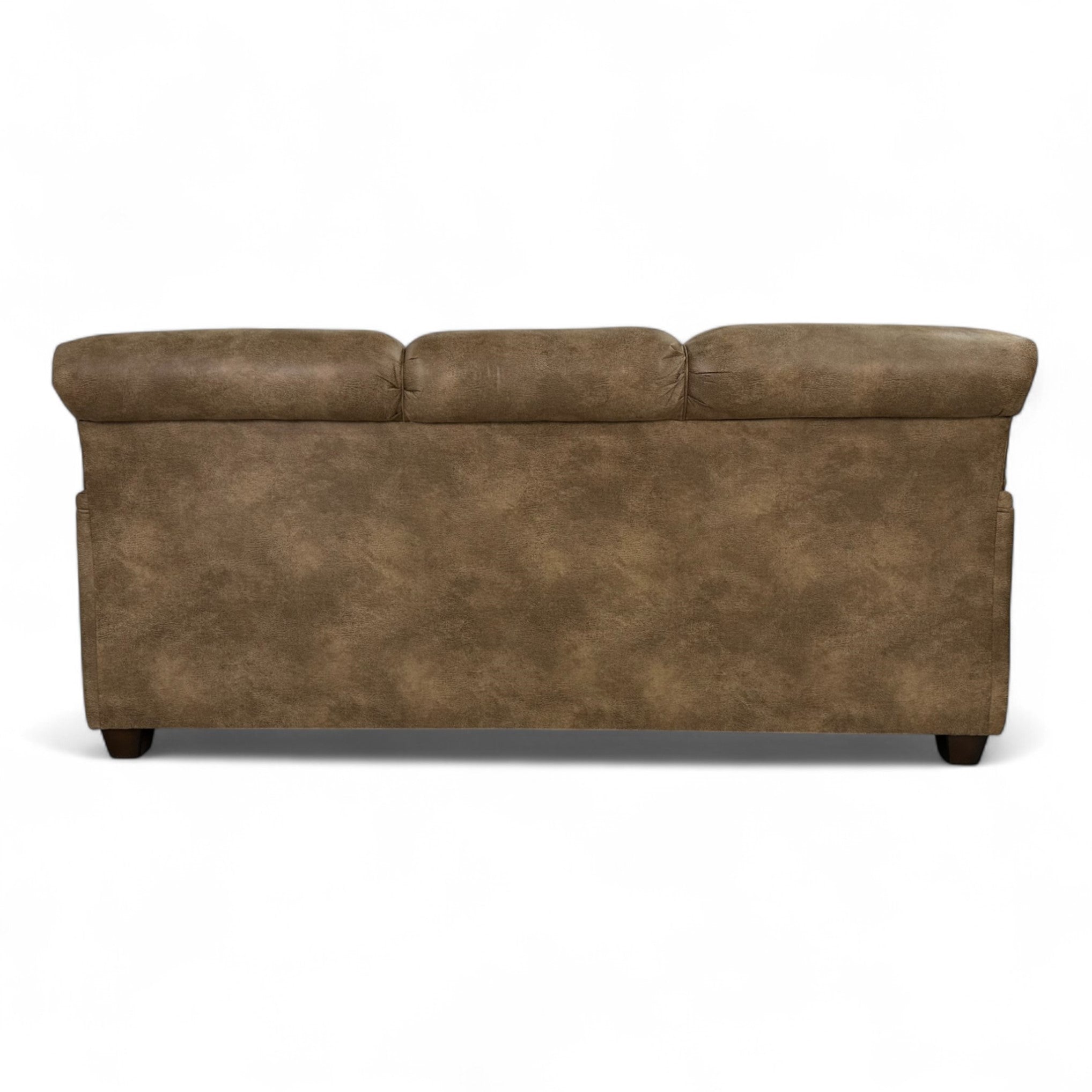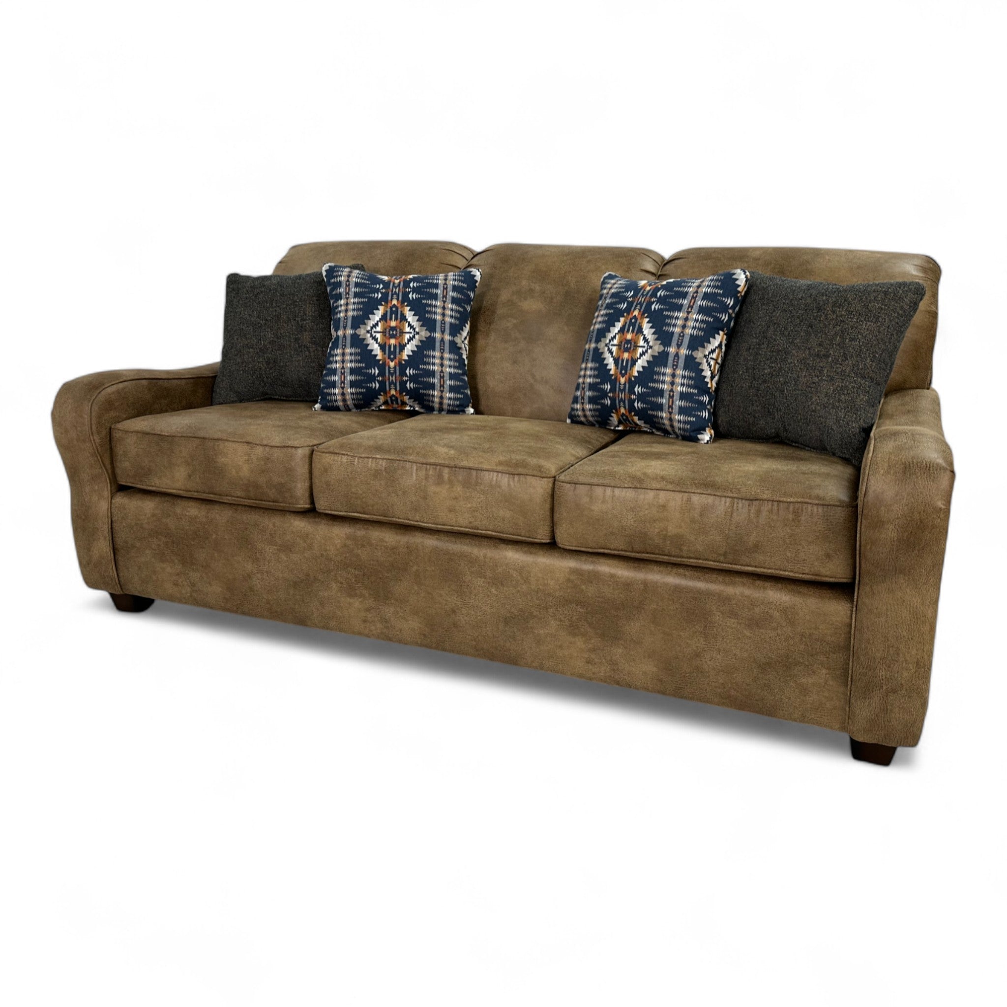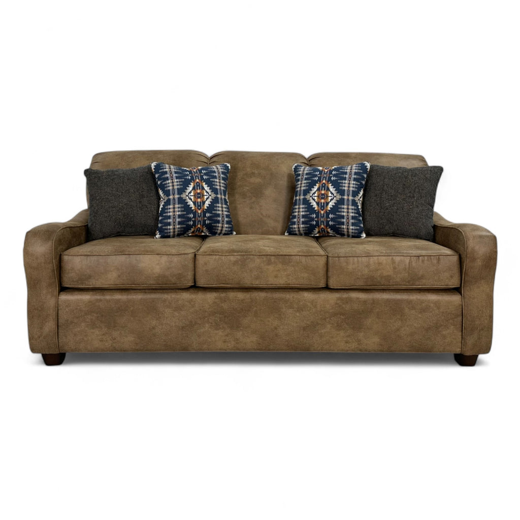 The Barker Tahoe Sofa offers the perfect balance of rugged style and inviting comfort. Upholstered in Vagabond Brandy microfiber, this sofa brings a warm, distressed look with a soft, lived-in feel. Handcrafted in the USA, it features foam seats with Dacron-filled backs and seat tops for lasting comfort and support. The dark brown leg finish and large antique brown nailhead trim add rustic sophistication, while four 18" pillows—two in Roam Denim fabric and two in Juniper Mesa fabric—introduce bold pattern and texture. A blend of craftsmanship and casual elegance, the Barker Tahoe Sofa is designed to anchor your space with character and comfort.