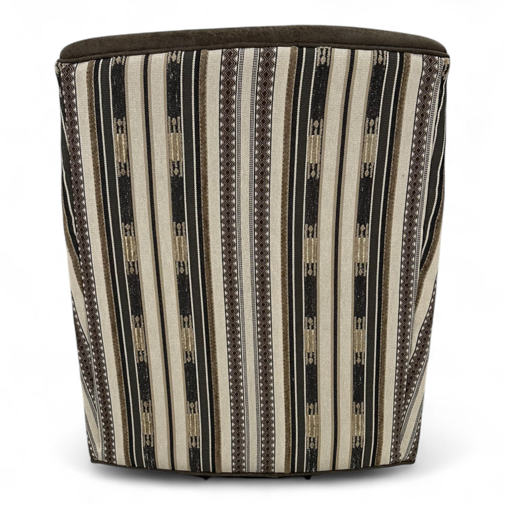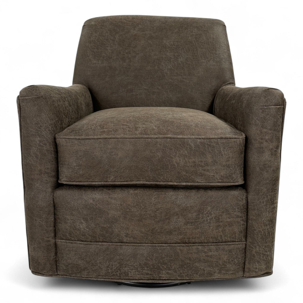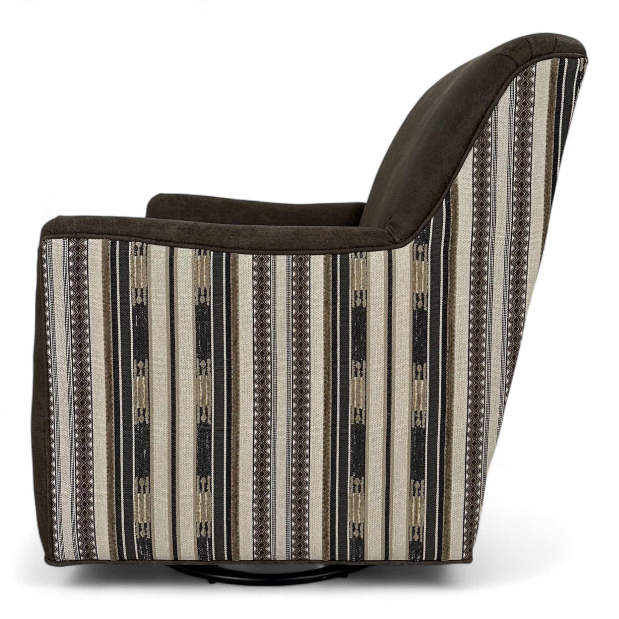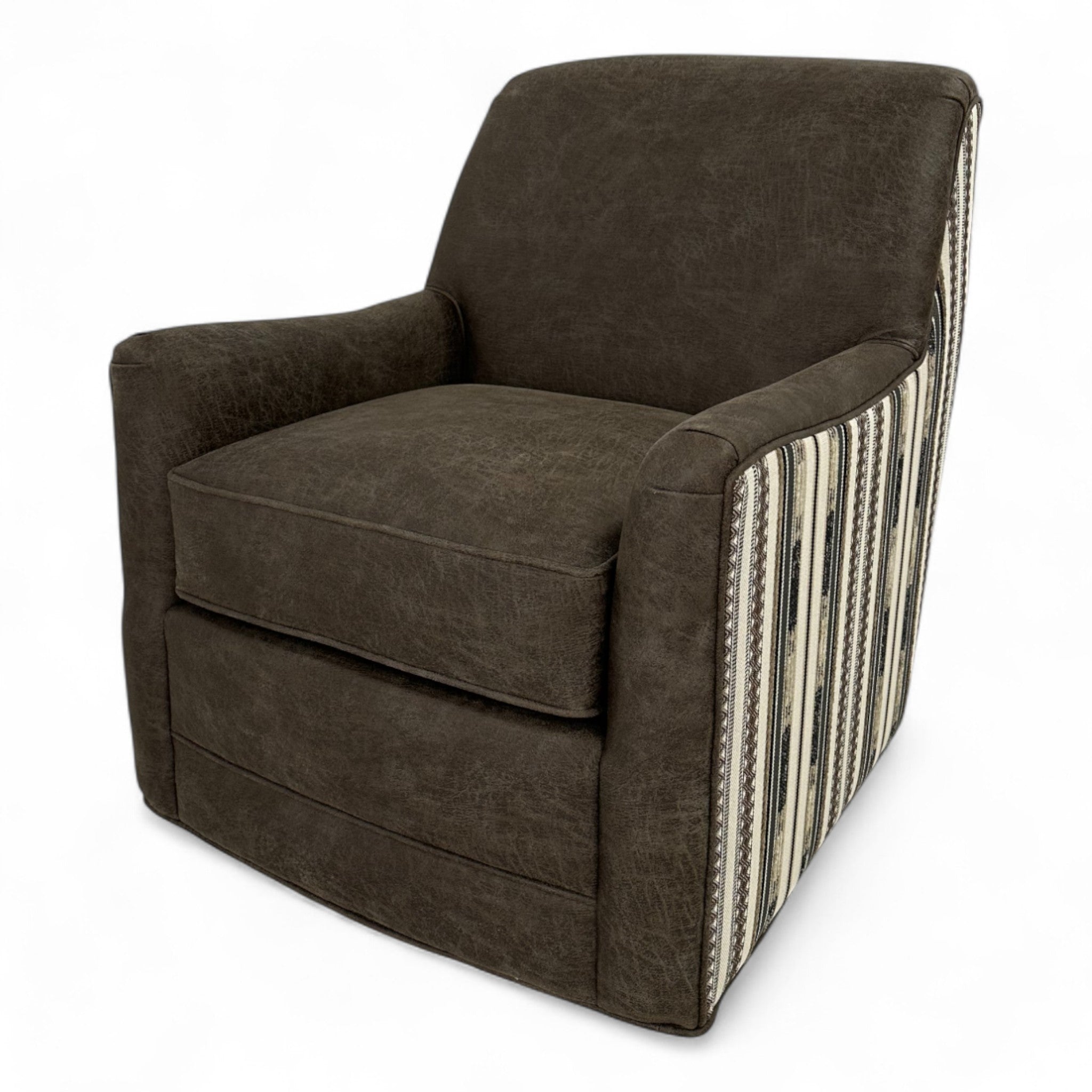 The Tate Hearth Swivel Glider combines timeless style with everyday comfort. Upholstered in Northwest Mink and Lombok Tuxedo fabrics, it offers a refined mix of rich texture and subtle pattern for a versatile look. Handcrafted in the USA, this chair features a foam seat with Dacron-filled back and seat top, ensuring supportive comfort with a soft, inviting feel. Its smooth swivel and gentle gliding motion make it a perfect choice for relaxing in any living space.