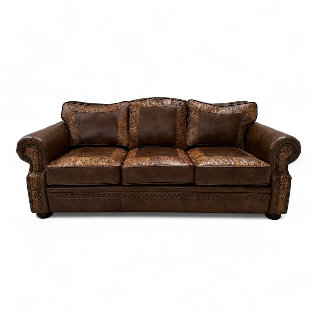 The Telluride Creststone Sofa brings rich character and elevated comfort together in a striking, handcrafted design. Upholstered in Legends Tumbleweed leather—an exquisite hand-rubbed aniline hide from South America—it showcases a warm, earthy patina that pairs beautifully with its tooled designer leather accents. The sculpted back cushions, rolled arms, and detailed panel work highlight the depth and artistry of the leather, while brass nailhead trim and a walnut foot finish complete the look with refined rustic appeal. Handcrafted in the USA, it features foam seats with Dacron-filled backs and seat tops for lasting comfort and support. Timeless, bold, and beautifully crafted, the Telluride Creststone Sofa stands as a statement piece designed to anchor your space with luxury and style.